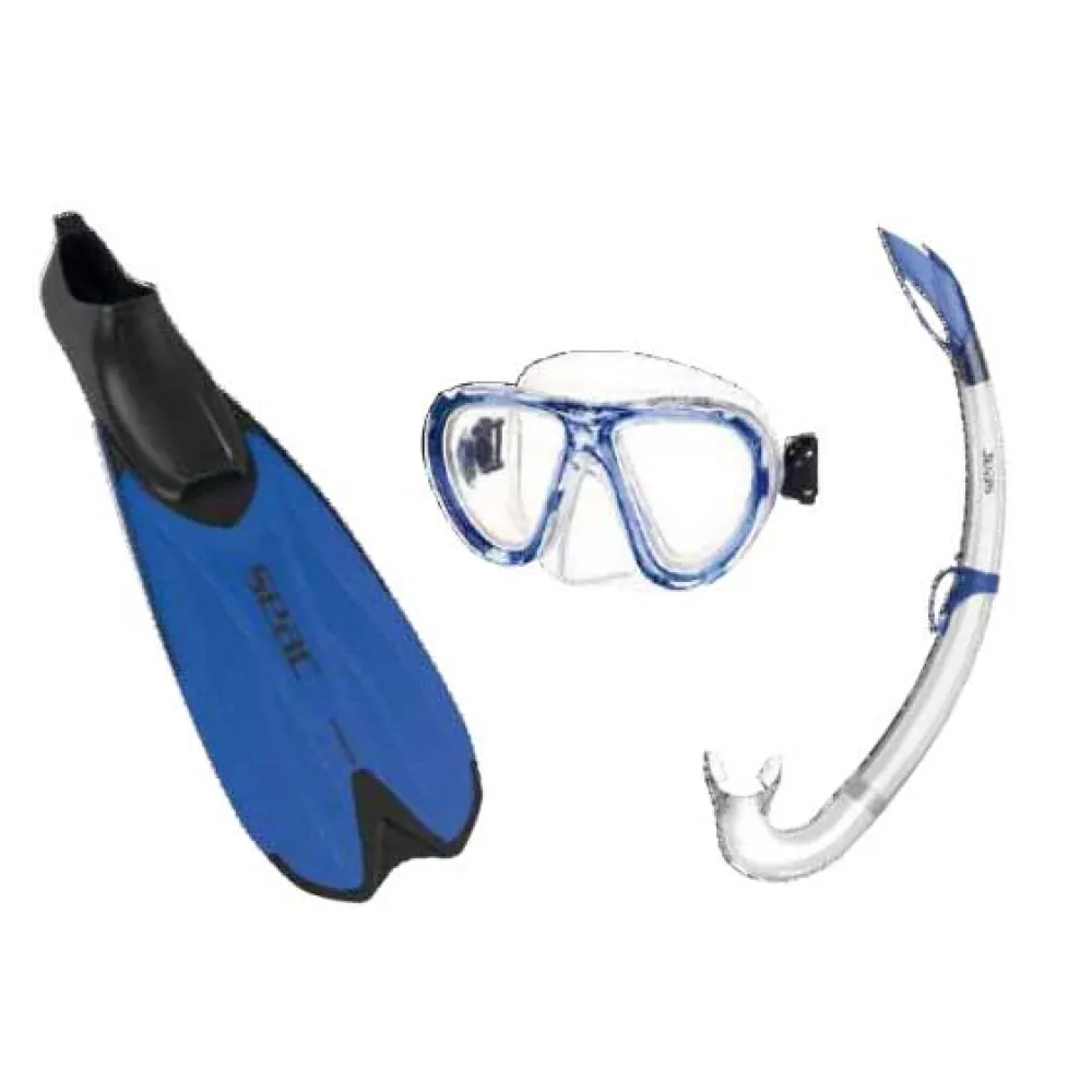 Set bevat Spinta voetzolen, een Bella siliconen masker en een Miniflash-snorkel.
